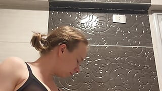 Mi tía estaba sentada en el baño, la abracé y comencé a follarla por el culo.